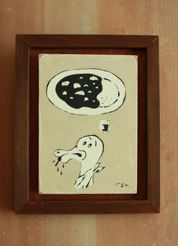 3月にギャラリーROCKET行われた作品です。皆大好きカレーライス!にしました。額もニスで塗って作りました。怪しいカレー屋にかけてある絵をイメージしました。アヒルがスプーンくわえてたらなんか可愛いかな?と思って描きました。